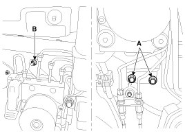 7. Loosen the HECU bracket bolts (A) and nut (B), then remove HECU and bracket.