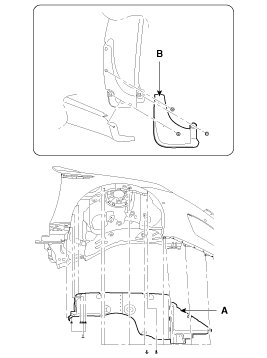 2. After loosening the mounting clips and screws, then remove the front wheel guard (A), mud guard (B).