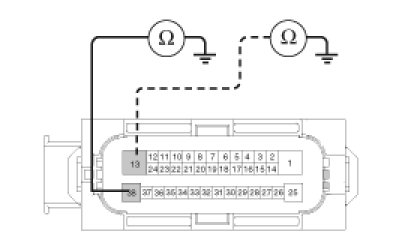 2. Check for continuity between terminals 13, 38 of the ABS control module harness side connector and ground point.