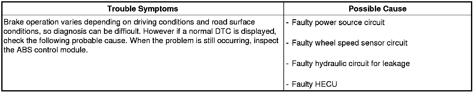 During ABS operation, the brake pedal may vibrate or may not be able to be depressed. Such phenomena are due to intermittent changes in hydraulic pressure inside the brake line to prevent the wheels from locking and is not an abnormality.
