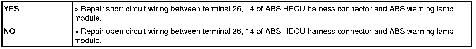 Check for continuity between terminal (M08) 30 of the cluster harness side connector and terminal 14 of ABS HECU harness side.