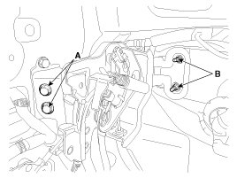 6. Remove the parking brake pedal mounting bolts (A) and nuts (B).