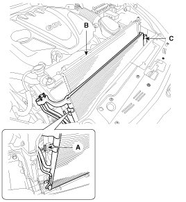 7. Disconnect the pin (A) and then remove the condenser (C) from radiator (B).