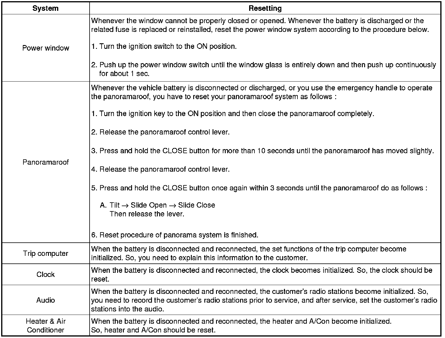 When reconnecting the battery cable after disconnecting, recharging battery after discharged or installing the memory fuse located on the driver's side panel after removing, be sure to reset systems mentioned in the below table.
