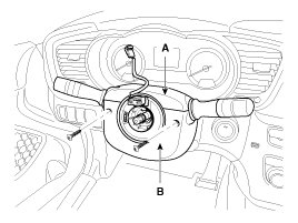 5. Disconnect the lock nut (A) & connector (B) and the remove the steering wheel from the steering column shaft.