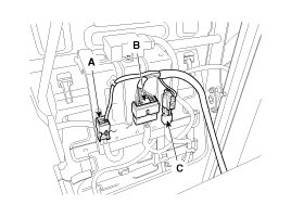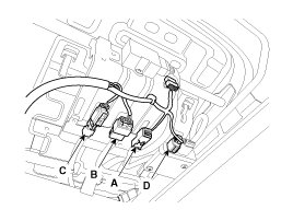 2. Disconnect the seat buckle connector (A), seat warmer connector (B), Side Airbag (SAB) connector(C), Weight Classification System (WCS) connector (D).