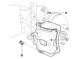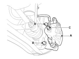 2. Loosen the hose eyebolt (C) and caliper mounting bolts (B), then remove the front caliper assembly (A).