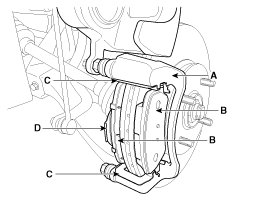 3. Replace pad shim (D), pad retainers (C) and brake pads (B) in the caliper carrier (A).
