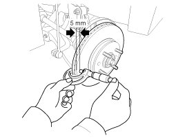 1. Place a dial gauge about 5mm (0.2 in.) from the outer circumference of the brake disc, and measure the runout of the disc.
