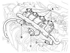 8. Disconnect the ignition coil connectors (A), the injector extension connector (B), the VIS (Variable intake system) connector (C) and the PCSV (Purge control solenoid valve) connector (D).