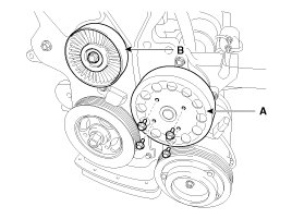 26. Remove the water pump pulley (A) and the drive belt idler (B).