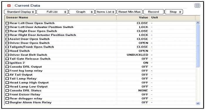 3. To consult the present input/output value of BCM, "Current DATA". It provides information of BCM input/output conditions of door lock/unlock, lamp control and power window timer etc.