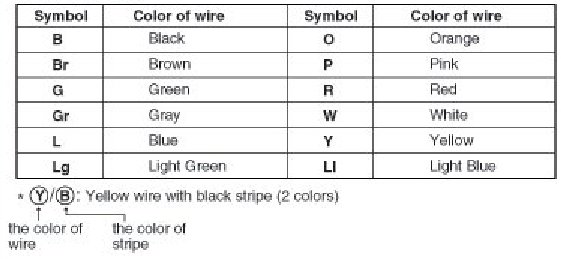 The following abbreviations are used to identify wire colors in the circuit schematics.