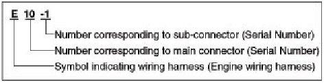 A connector identification symbol consists of a wiring harness location classification symbol corresponding to a wiring harness location and number corresponding to the connector.