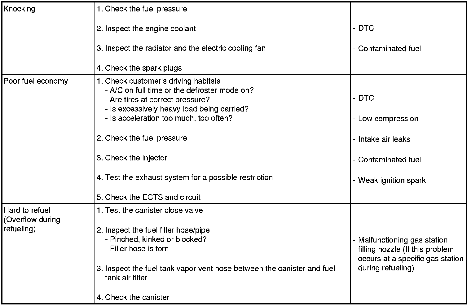 Sometimes the most difficult case in troubleshooting is when a problem symptom occurs but does not occur again during testing. An example would be if a problem appears only when the vehicle is cold but has not appeared when warm. In this case, the technician should thoroughly make out a "Customer Problem Analysis Sheet" and recreate (simulate) the environment and condition which occurred when the vehicle was having the issue.