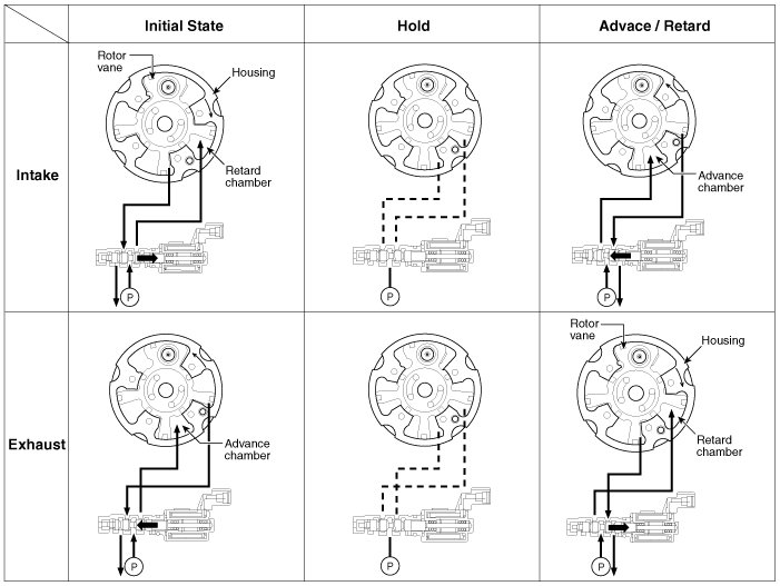 The engine oil getting out of the CVVT oil control valve varies the cam phase in the direction (Intake Advance/Exhaust Retard) or opposite direction (Intake Retard/Exhaust Advance) of the engine rotation by rotating the rotor connected with the camshaft inside the cam phaser.
