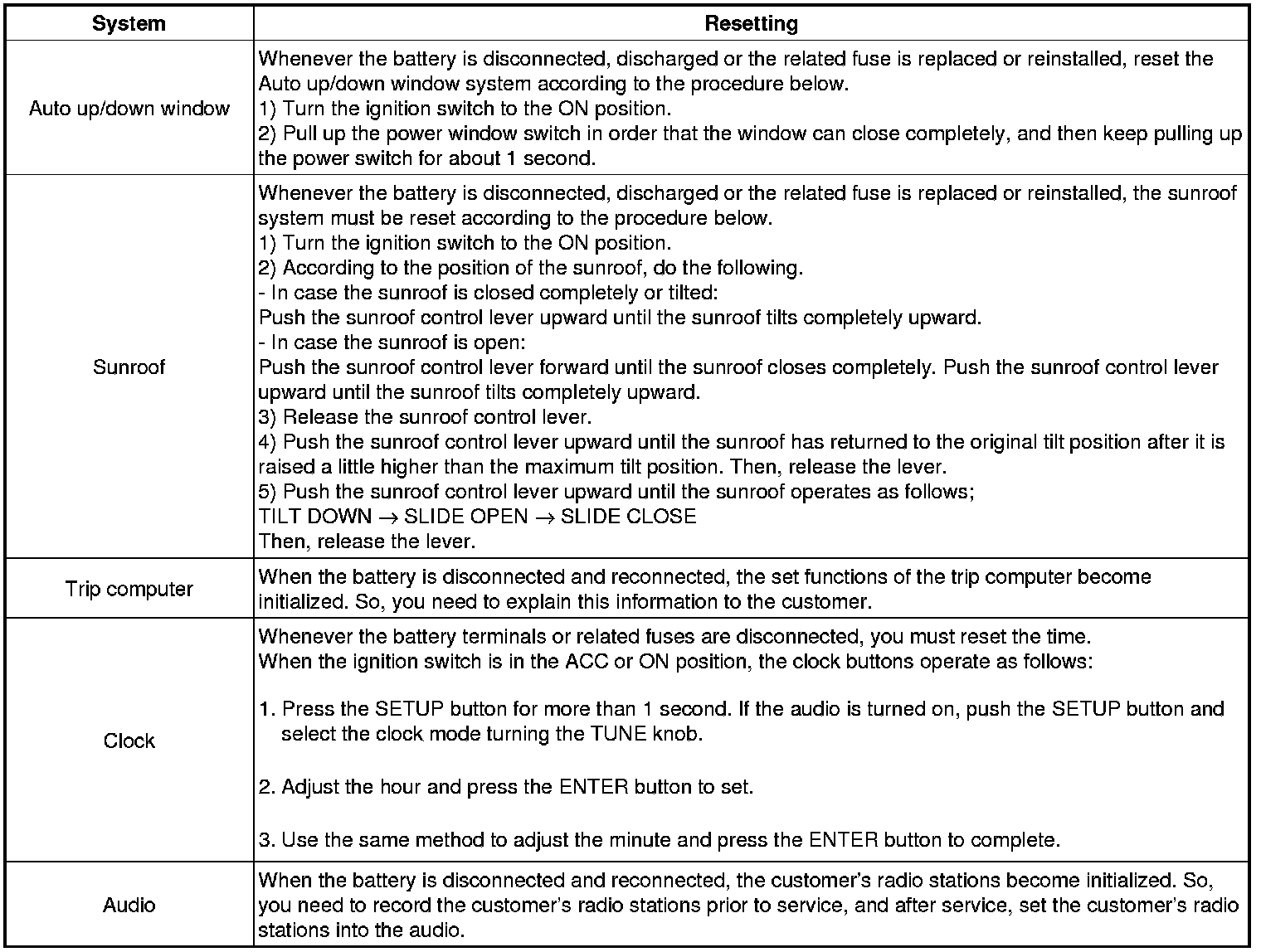 When reconnecting the battery cable after disconnecting, recharging battery after discharged or installing the memory fuse located on the driver's side panel after removing, be sure to reset systems mentioned in the below table.