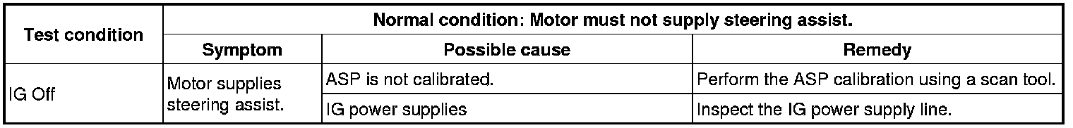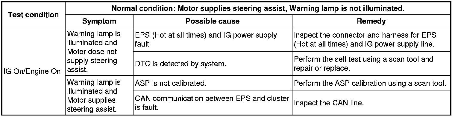 After or before servicing the EPS (Electronic Power Steering) system, perform the troubleshooting and test procedure as follows. Compare the system condition with normal condition in the table below and if abnormal symptom is detected, perform necessary remedy and inspection.