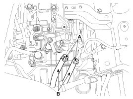 5. Disconnect the hose (B) after removing the automatic transaxle fluid cooler hose clamp (A).