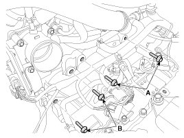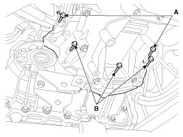 9. Remove the automatic transaxle upper mounting bolt (A-2ea) and the starter motor mounting bolt (B-2ea).