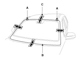 3. Install the spacer (A) install the windshield glass (B) temporarily with marking sure to position them on the center, and then place the alignment mark (C).