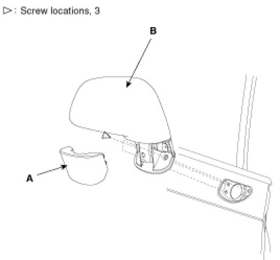 3. After disconnecting the connector (A), remove the outside rear view mirror (B).