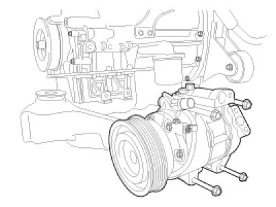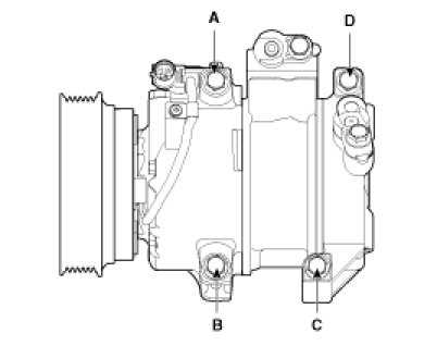 6. Disconnect the compressor clutch connector (A), and then remove 4 mounting bolts and the compressor.