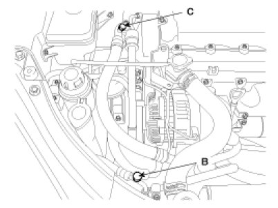 Recovery/Recycling/Charging System (A) to the high-pressure service port (B) and the low-pressure service port (C) as shown, following the equipment manufacturer's instructions.