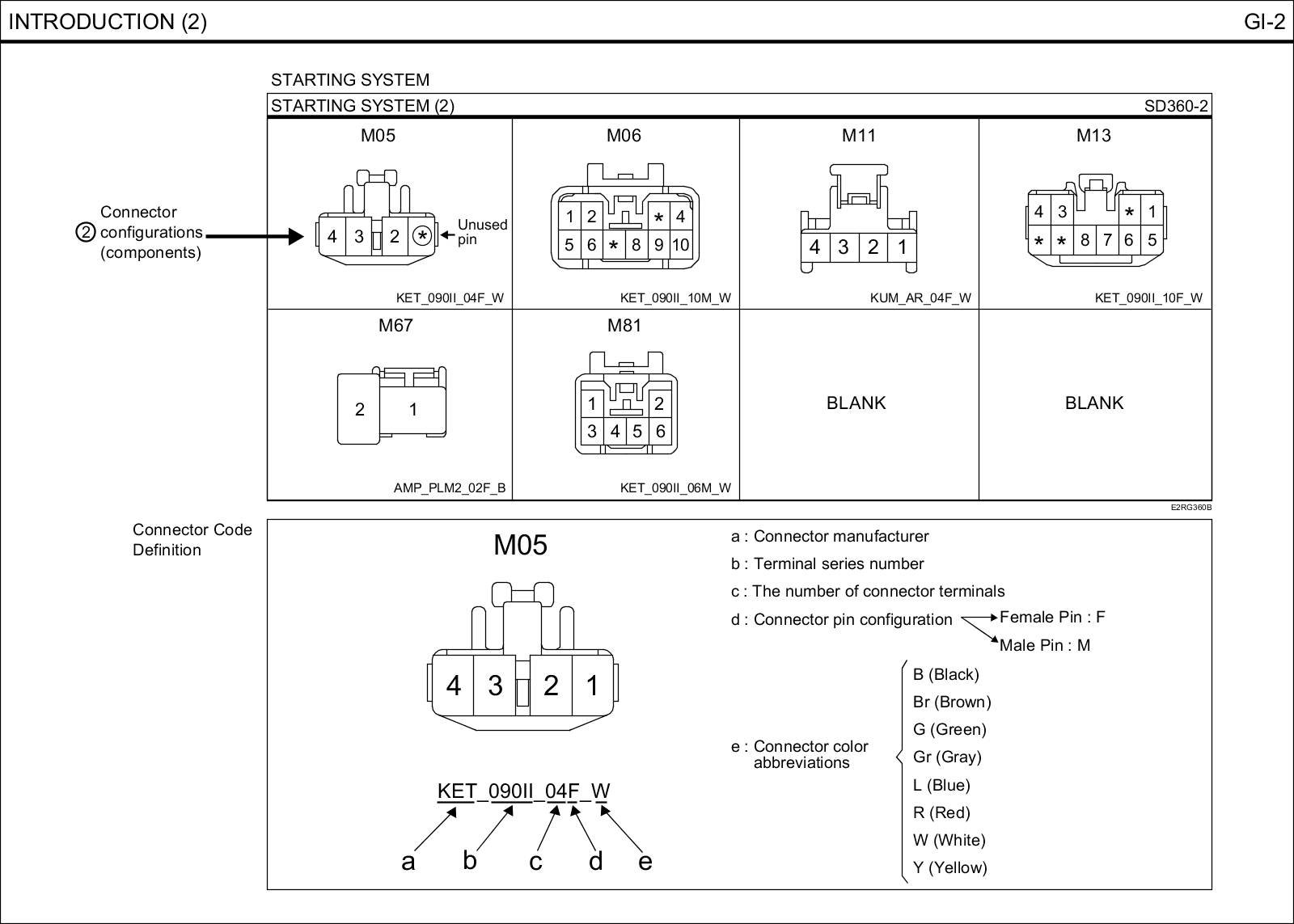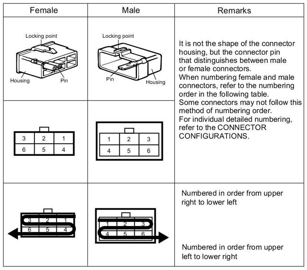 - The "Connector Configurations" section identifies connectors that are used to join harnesses together, junction connectors for common power and group wires are also identified in this section. Male and female connector views are shown where applicable.
