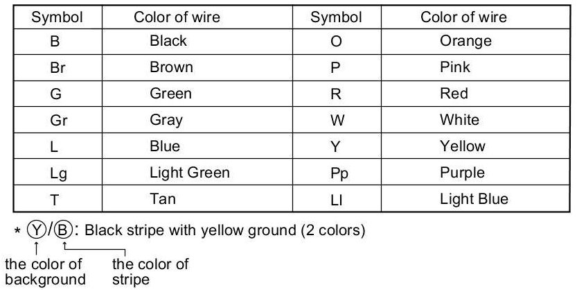The following abbreviations are used to identify wire colors in the circuit schematics.