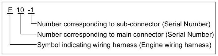 A connector identification symbol consists of a wiring harness location classification symbol corresponding to a wiring harness location and number corresponding to the connector.
