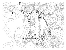 23. Disconnect the ground line (A) and then remove the engine mounting support bracket (B).