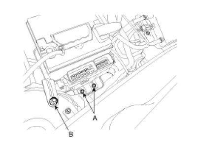 4. Remove the mounting bolts (A) and nut (B), and then remove the ECM bracket assembly.