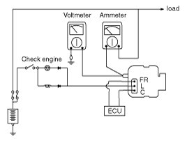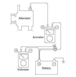 1. Check to see that the voltmeter reads as the same value as the battery voltage. If the voltmeter reads 0V, and the open circuit in the wire between alternator "B" terminal and battery (+) terminal or poor grounding is suspected.