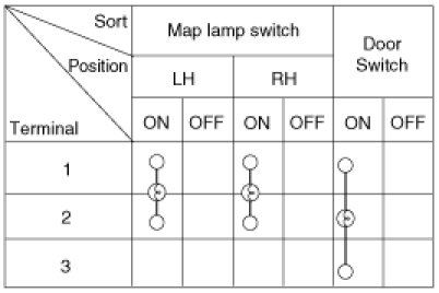 Remove the overhead console lamp assembly then check for continuity between terminals. If the continuity is not as specified, replace the map lamp switch.
