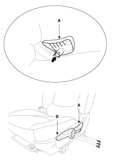 2. After loosening the mounting bolts, then disconnect the seat back frame (A) and seat cushion frame (B).