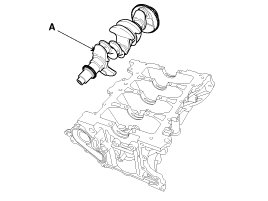 23. Lift the crankshaft (A) out of the engine, being careful not to damage journals.