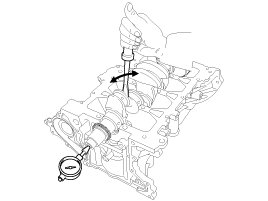 Apply a sufficient amount of engine oil to outer surface of the piston, inner surface of piston pin hole and small end bore of the connecting rod before inserting the piston pin.