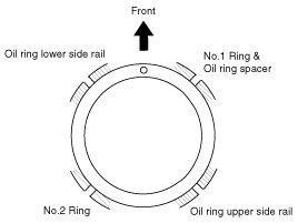(3) Position the piston rings so that the ring ends are as shown. (The No.1 ring should be on the opposite side of the No.2 ring.)