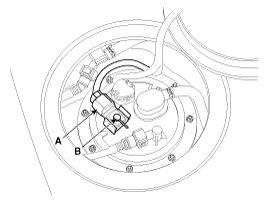 5. Remove the fuel tank pressure sensor (B) after releasing the hooks vertically.