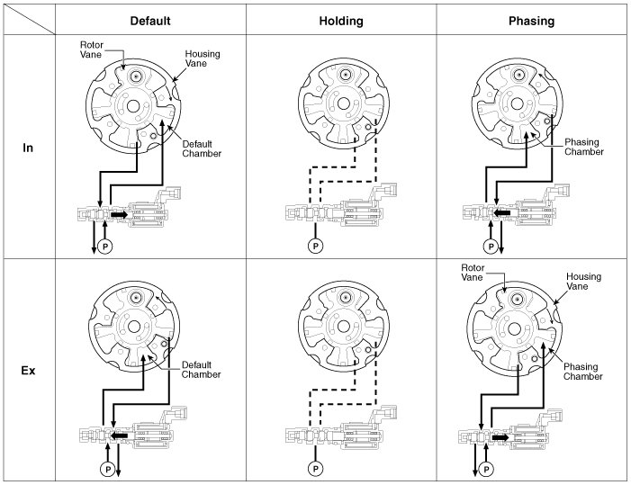 The engine oil getting out of the CVVT oil control valve varies the cam phase in the direction (Intake Advance/Exhaust Retard) or opposite direction (Intake Retard/Exhaust Advance) of the engine rotation by rotating the rotor connected with the camshaft inside the cam phaser.