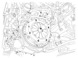 - Loosely tighten every clutch cover bolts, then torque to specifications in a diagonal direction. This can prevent twisting, vibration of the cover, and the lifting of the pressure plate.