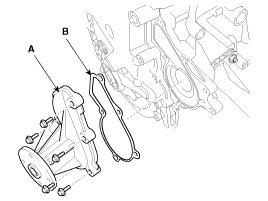 Install the water pump assembly (A) with the gasket (B).