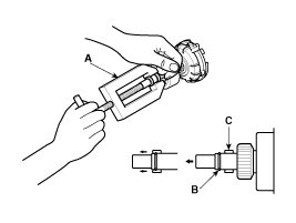4. Remove the brush holder assembly (A), armature assembly (B) and yoke assembly (C).