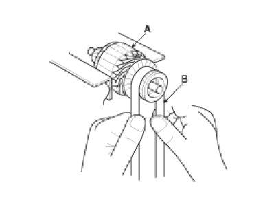 Make sure there is no continuity between the (+) brush holder (A) and (-) plate (B). If there is continuity, replace the brush holder assembly.