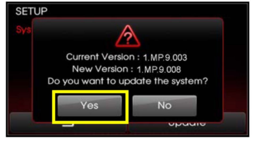 13. Check that "New Version" is correct for this TSB and Service Action (New version is 1.MP.9.008); if version is correct, then touch "Yes" button on screen.