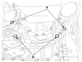 8. Remove the automatic transaxle upper mounting bolt (A-2ea) and the starter motor mounting bolt (B-2ea).