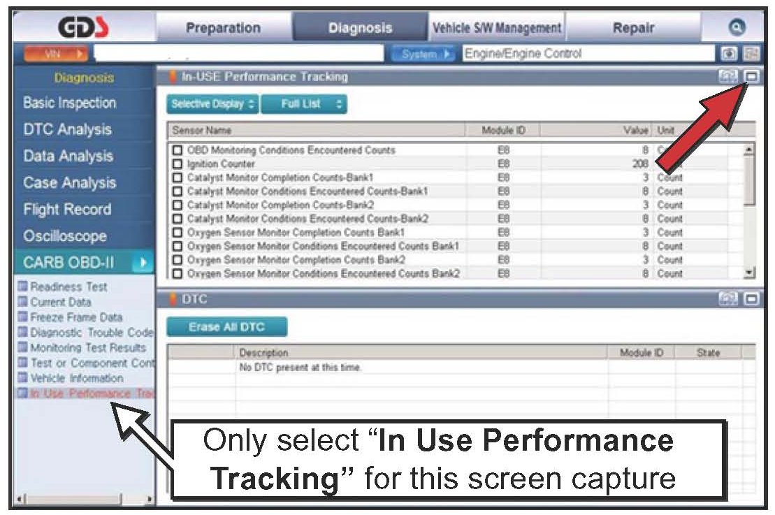 7. Click on "IN USE Performance Tracking" found in the CARB OBD-II list at the bottom left of the screen. Then click the "Expand" button at the top right corner of "IN-USE Performance Tracking" window.