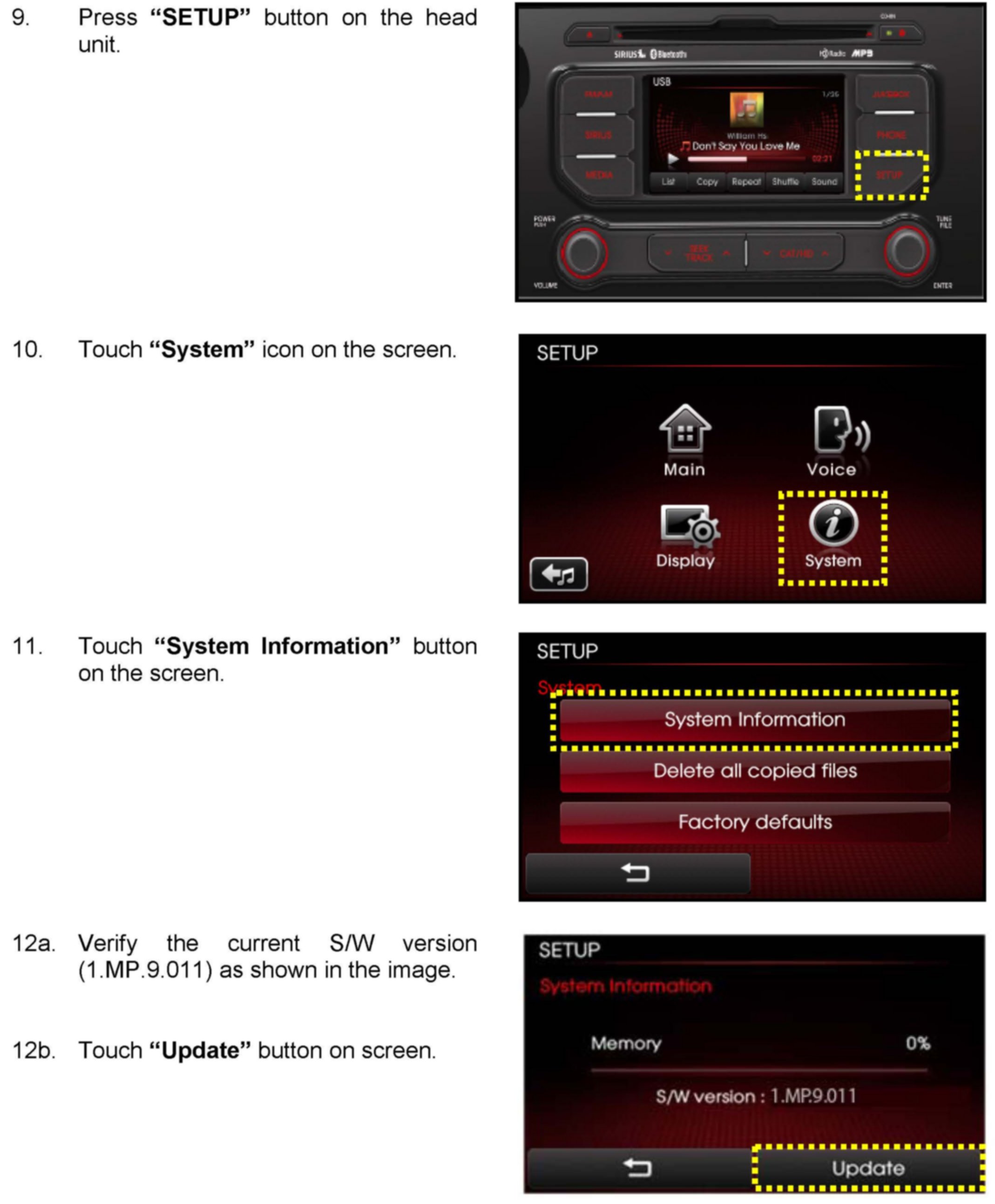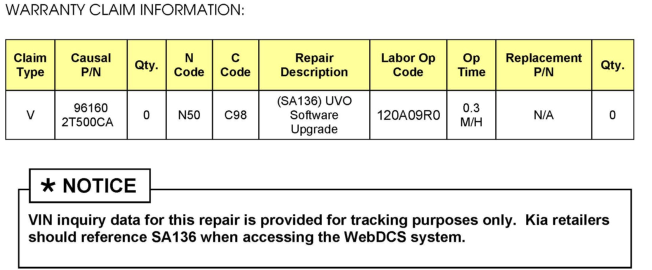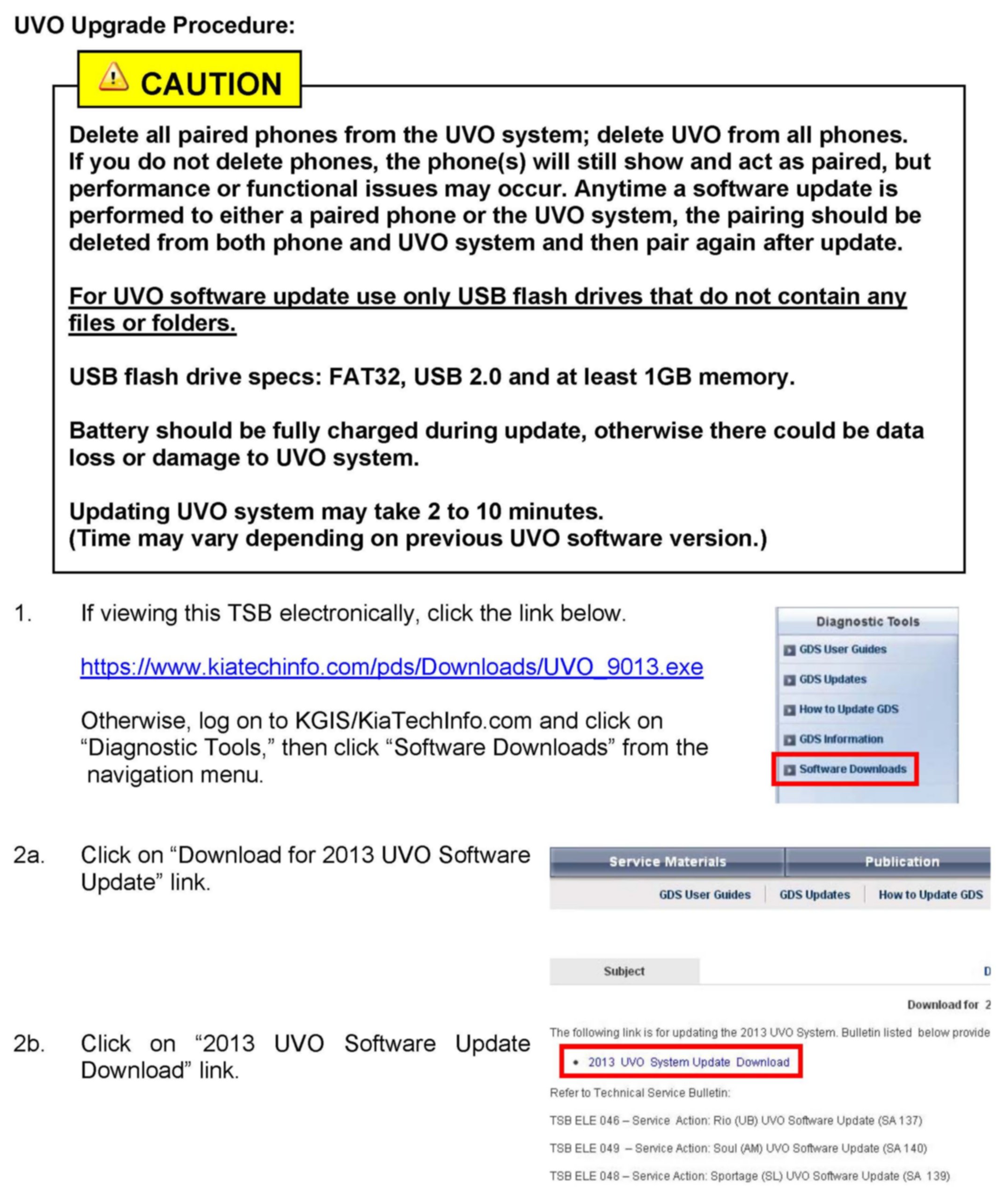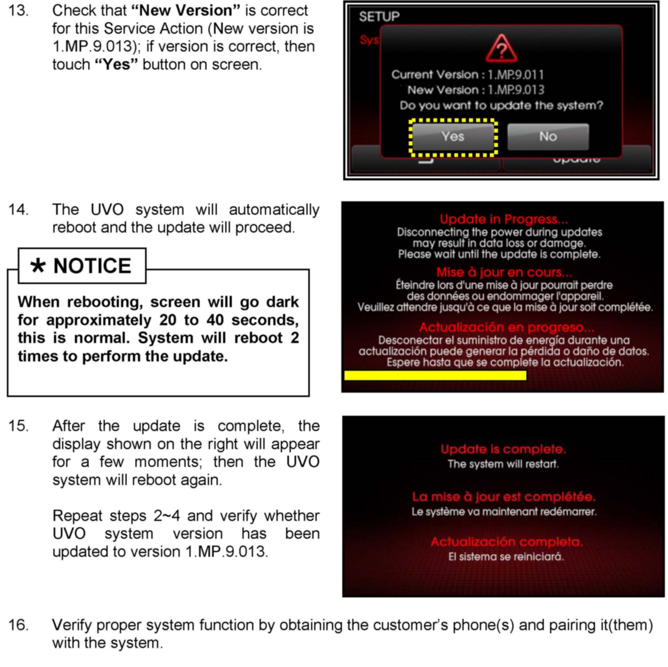 This bulletin provides the procedure for upgrading the 2013MY Optima UVO system. Kia is requesting the completion of this Service Action on all affected 2013MY Optima vehicles prior to delivery. Before conducting the procedure, verify that the vehicle is included in the list of the affected vehicles.