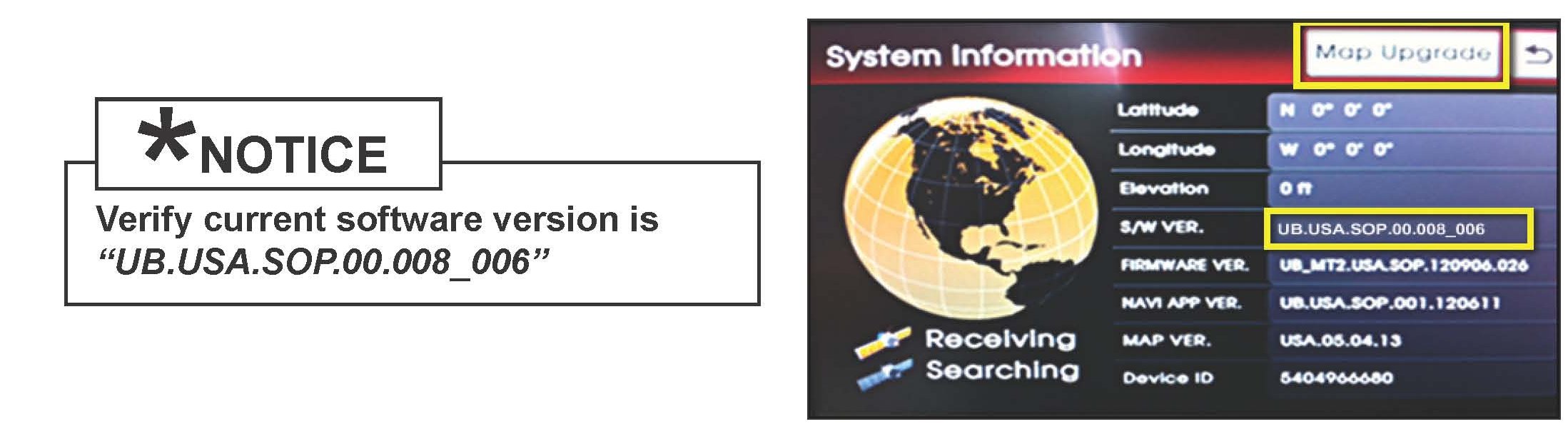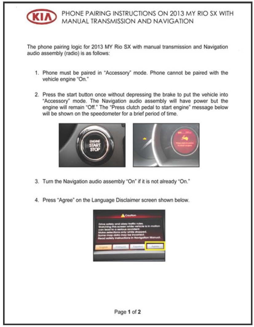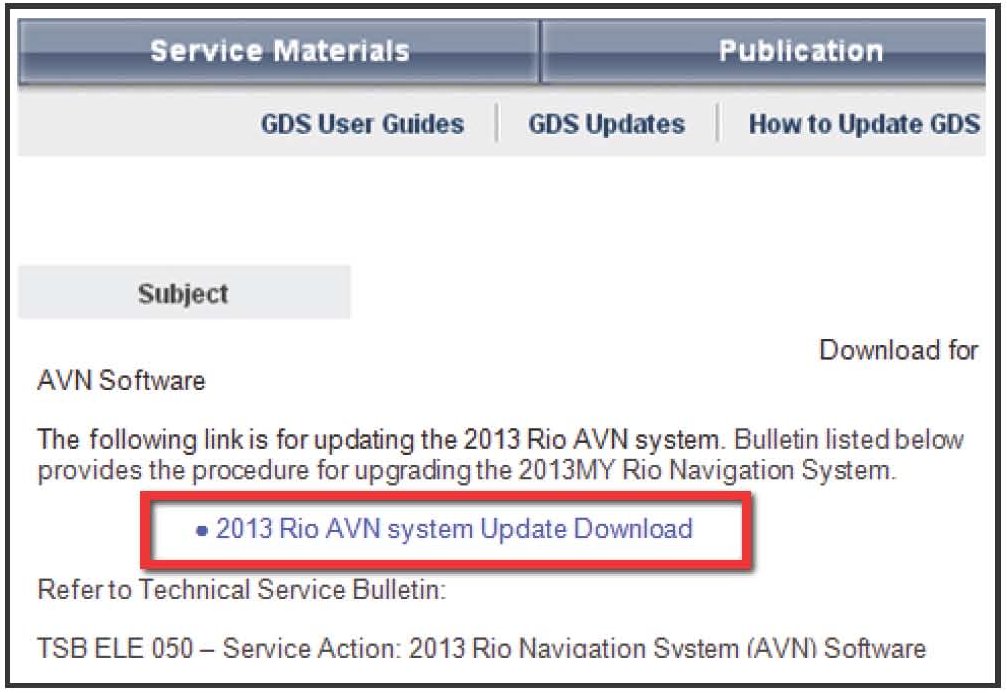 This bulletin describes the procedure to update the navigation system software and modify the phone pairing logic in 2013MY Rio vehicles with navigation system (AVN) and manus transmission, produced From June 12, 2012 to Aug. 29, 2012. Verify navigation system software version by referring to the table; then follow the procedure outlined in this TSB to update the navigation system. Kia is requesting the completion of this Service Action on all affected vehicles in dealer stock prior to delivery. Before conducting procedure verify that the vehicle is included in the list of the affected VINs.